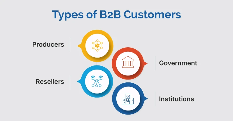 B2B customers can be categorized into four main types: producers, resellers, governments, and institutions. Each type of customer has unique expectations based on their business needs and goals.